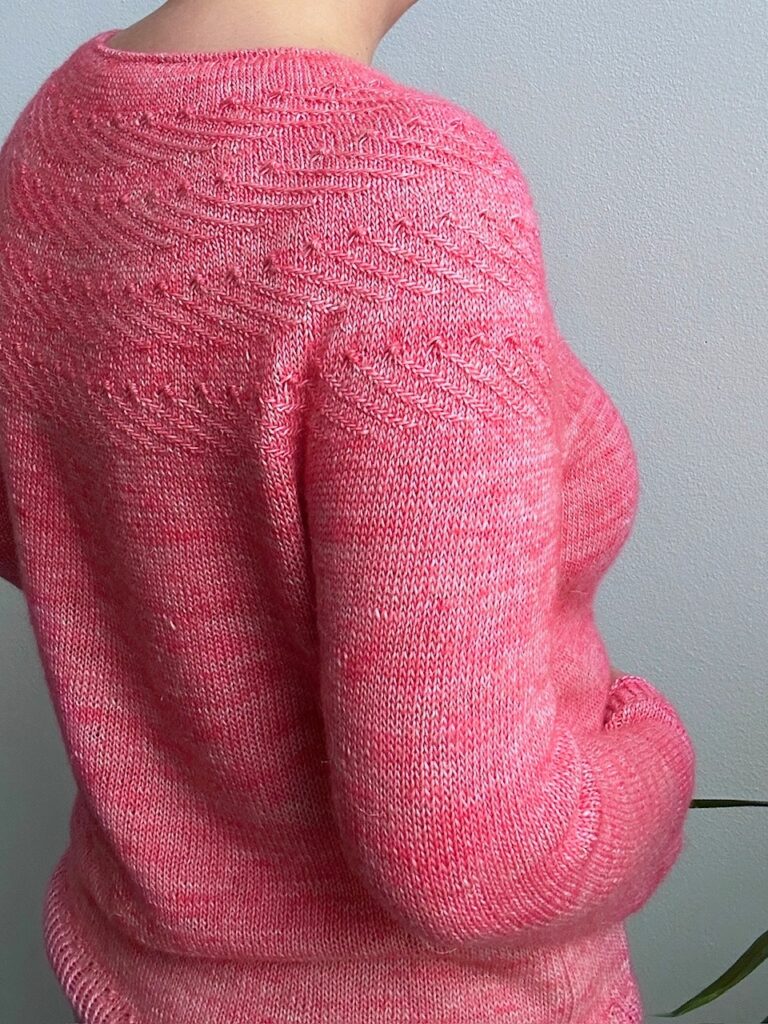 Nach dem Abteilen der Ärmel wird der Körper glatt rechts gearbeitet. Kurz vor dem Saum setzt ein schlichtes Muster einen dezenten Akzent, bevor das Oberteil mit einem klassischen 1×1-Bündchen aus verschränkten Maschen abgeschlossen wird.